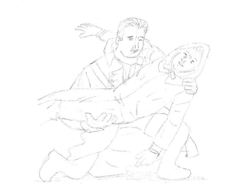 This second sketch is a "deleted scene" from the latest story. Major Magus is gently scooping up a paralyzed old woman (it still happens in the story, but I decided to go without the drawing).